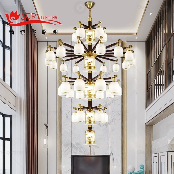 精骐迩铜高层/复式染色新中式吊灯 头数:24头以上 型号:JQR8921-5+15+10+5四层大灯/全铜+乌檀木+铜雕花