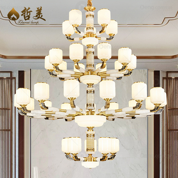 新中式 吊灯 铜+玉石灯臂 玉石中柱 防尘罩