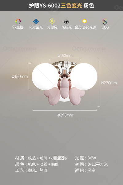 鸿瑞灯饰铁艺书房/卧室电镀北欧/宜家吸顶灯 型号:YS-6001款粉色+暗红