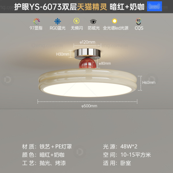 鸿瑞灯饰铁艺书房/卧室喷漆磨砂奶油风吸顶灯 型号:YS-6073-50双层款奶咖+暗红-天猫