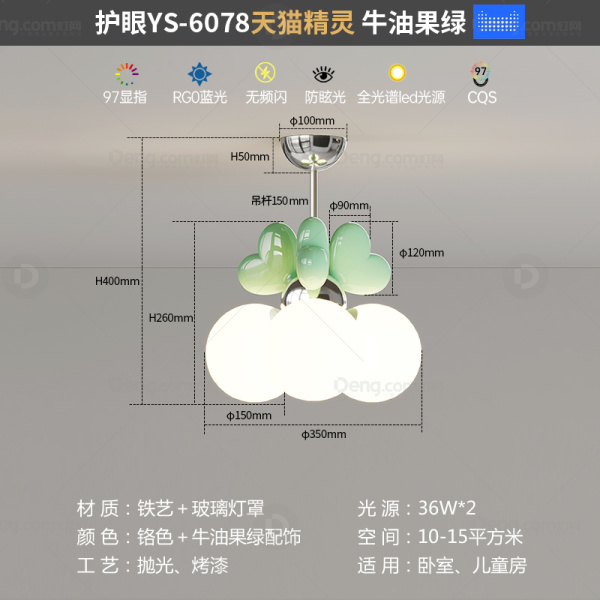 鸿瑞灯饰铁艺书房/卧室电镀奶油风吊灯 头数:3头 型号:YS-6078款铬色+牛油果绿-天猫
