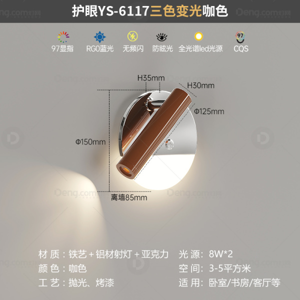 鸿瑞灯饰铁艺书房/卧室喷漆磨砂奶油风壁灯 头数:单头 型号:YS-6117款咖色+铬色