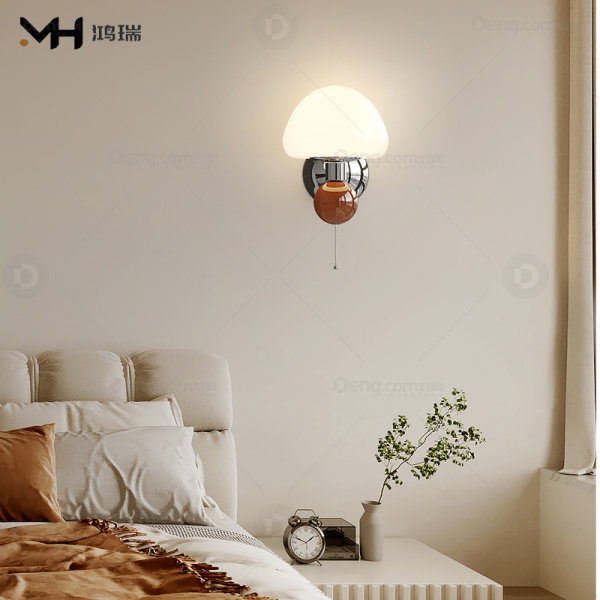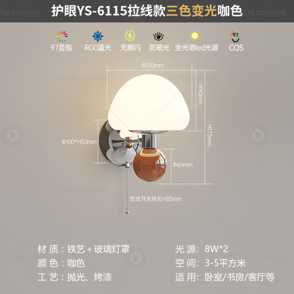 鸿瑞灯饰铁艺书房/卧室喷漆磨砂奶油风壁灯 头数:单头 型号:YS-6115拉线款咖球+铬色-三色