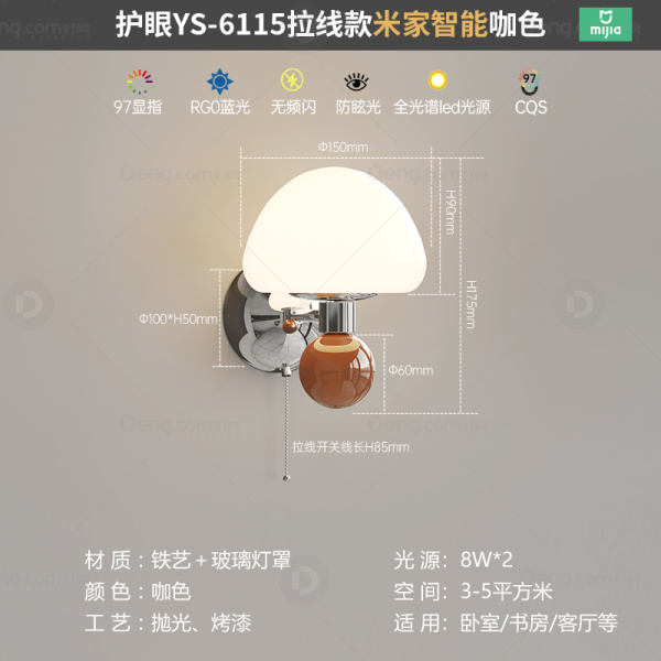 鸿瑞灯饰铁艺书房/卧室喷漆磨砂奶油风壁灯 头数:单头 型号:YS-6115拉线款咖球+铬色-mj