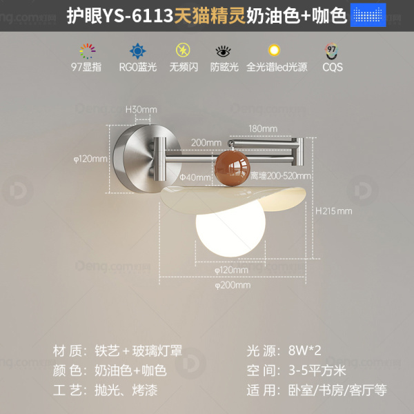 鸿瑞灯饰铁艺书房/卧室喷漆磨砂奶油风壁灯 头数:单头 型号:YS-6113款奶油色+咖球-天猫