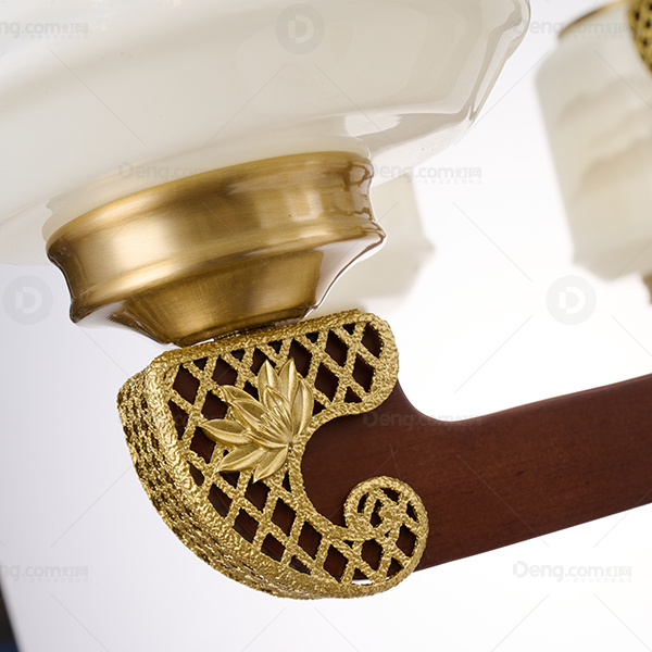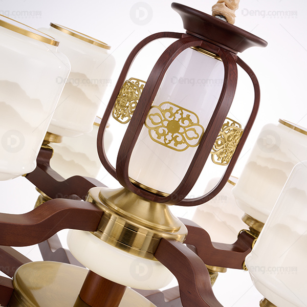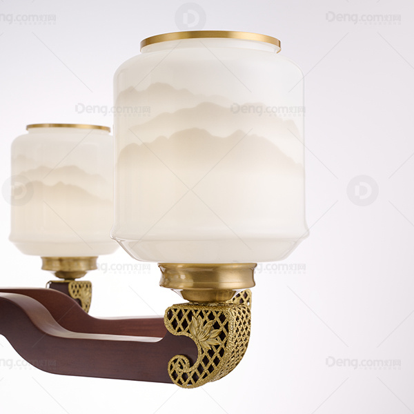 新中式 吊灯 铜合金+木灯臂 实木拉杆中柱 防尘灯罩