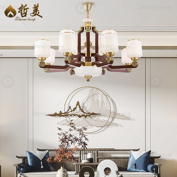 新中式 吊灯 铜合金+木灯臂 拉杆玉石中柱 防尘灯罩