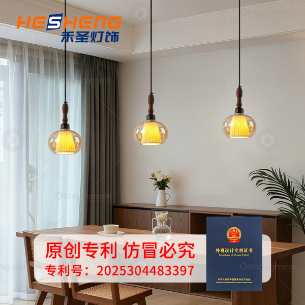禾圣铁艺餐厅电镀中古风吊灯 头数:3头 型号:D996302/3-胡桃色+琥珀色