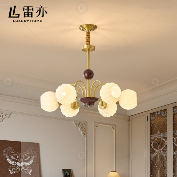雷亦铜书房/卧室电镀中古风吊灯 头数:6头 型号:D6882-6头(铜+橡木+玻璃罩)