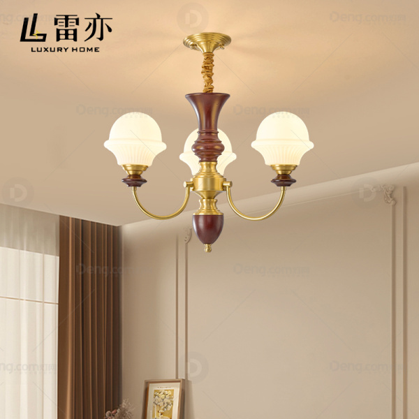 雷亦铜餐厅电镀中古风吊灯 头数:3头 型号:D6873-3头(铜+橡木+玻璃罩)