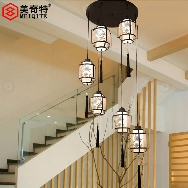 美奇特铁艺楼梯/拐角喷漆磨砂新中式吊灯 头数:6头 型号:MQT6838-6头黑色刺綉
