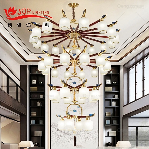 精骐迩铜别墅/酒店大堂染色新中式吊灯 头数:24头以上 型号:JQR8918-16+12+8+4四层大灯-铜+木