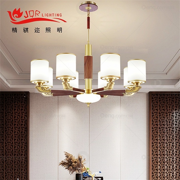 精骐迩铜客厅染色新中式吊灯 头数:8头 型号:JQR8072-8-铜+木