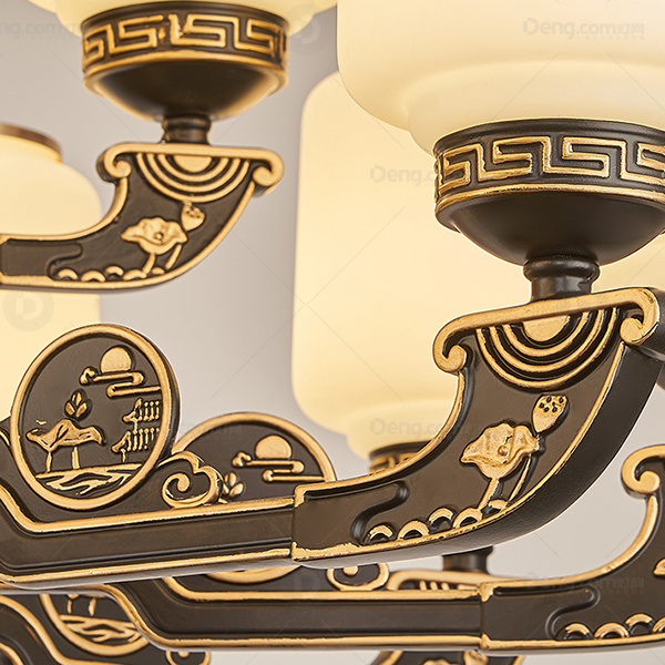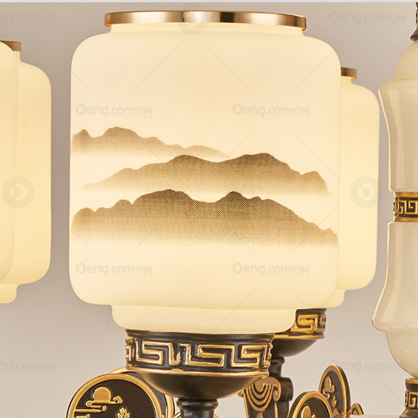 新中式 吊灯 锌合金压铸灯臂 黑擦金 山川水墨印花防尘灯罩