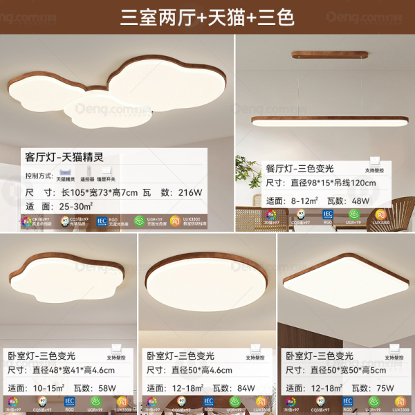 久觅铁艺客厅喷漆磨砂现代简约吸顶灯 型号:W912套餐/胡桃木色/三室两厅/无极天猫+三色