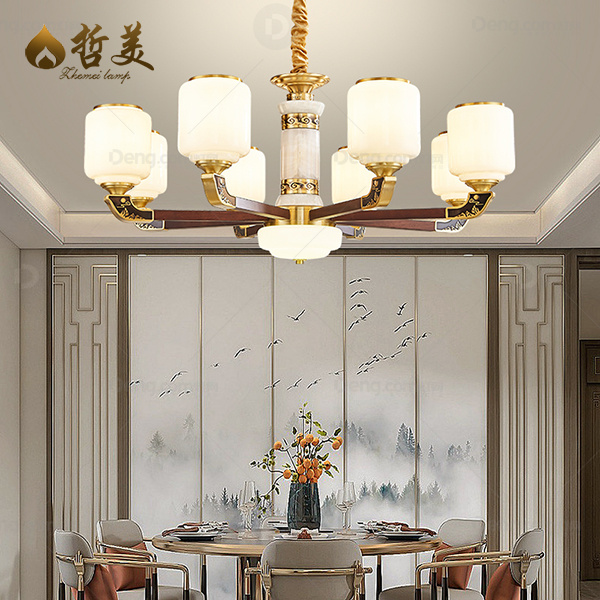 新中式 吊灯 铜+乌金木灯臂 玉石中柱 防尘罩