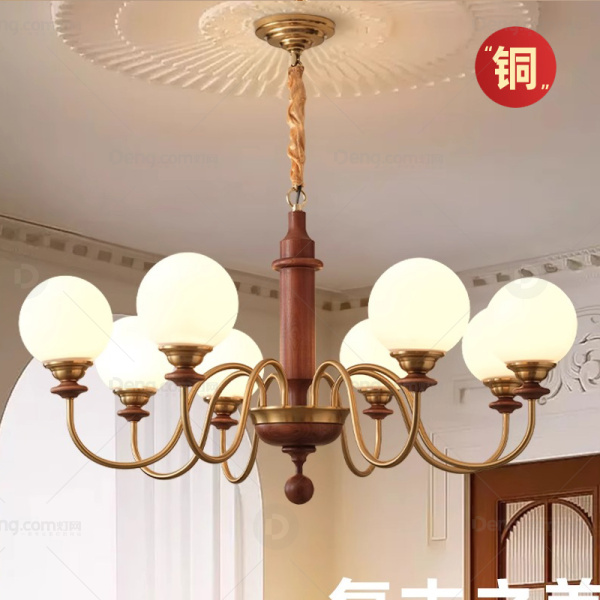 中古风吊灯,灯体:全铜+橡木,简约不单调,经久耐用。灯罩:奶白色玻璃灯罩,手感光滑细腻耐高温,柔和不刺眼。