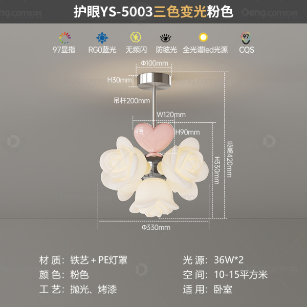 鸿瑞灯饰铁艺书房/卧室喷手漆奶油风吊灯 头数:3头 型号:YS-5003三色变光粉色