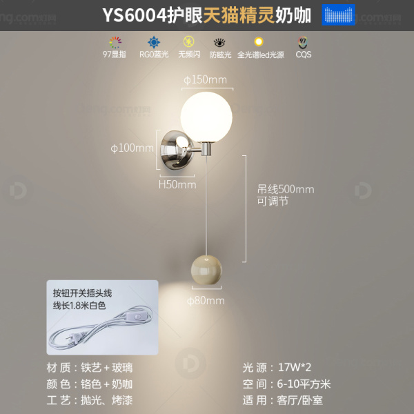 鸿瑞灯饰铁艺书房/卧室电镀奶油风壁灯 头数:单头 型号:YS-6004插头款电镀珞色+奶咖-天猫
