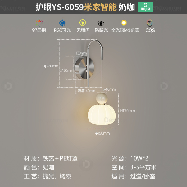 鸿瑞灯饰铁艺书房/卧室电镀奶油风壁灯 头数:单头 型号:YS-6059款奶咖+珞色-mj