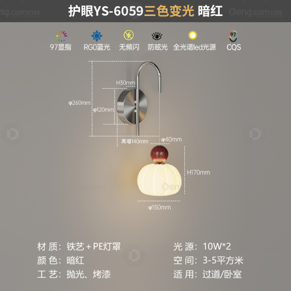 鸿瑞灯饰铁艺书房/卧室电镀奶油风壁灯 头数:单头 型号:YS-6059款暗红+珞色-三色