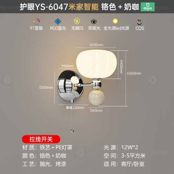 鸿瑞灯饰铁艺书房/卧室喷漆磨砂奶油风壁灯 头数:单头 型号:YS-6047拉线款铬色+奶咖-天猫