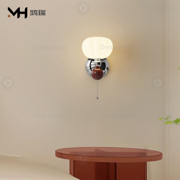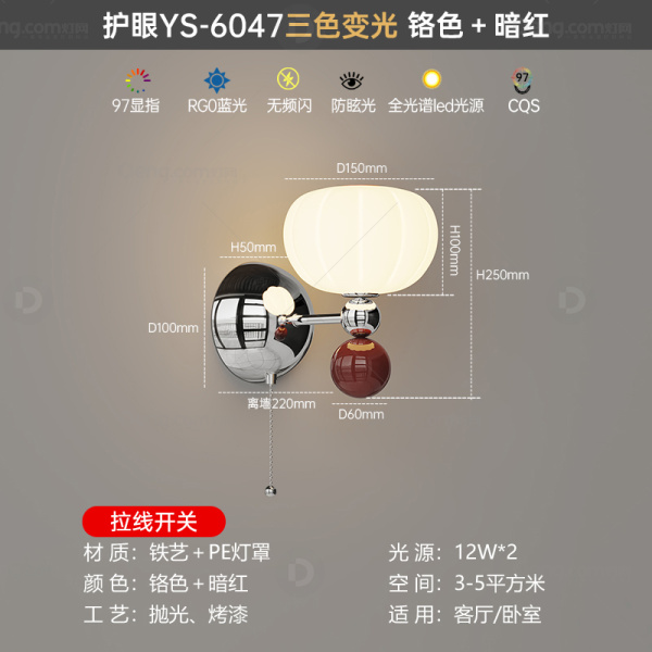 鸿瑞灯饰铁艺书房/卧室喷漆磨砂奶油风壁灯 头数:单头 型号:YS-6047拉线款铬色+暗红-三色