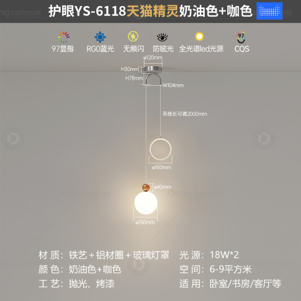 鸿瑞灯饰铁艺书房/卧室喷漆磨砂奶油风吊灯 头数:1头 型号:YS-6118款奶油色+咖球-天猫