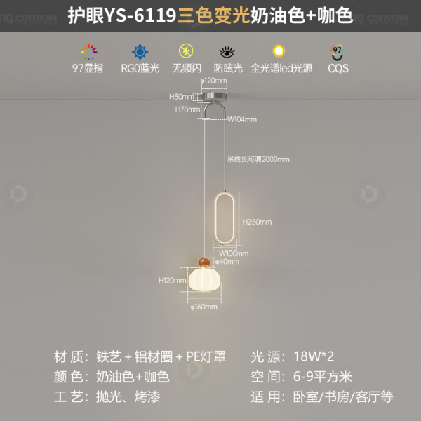 鸿瑞灯饰铁艺书房/卧室喷漆磨砂奶油风吊灯 头数:1头 型号:YS-6119款奶油色+咖球-三色