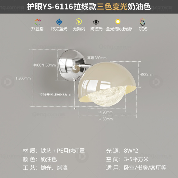 鸿瑞灯饰铁艺书房/卧室喷漆磨砂奶油风壁灯 头数:单头 型号:YS-6116拉线款奶油色+铬色-三色