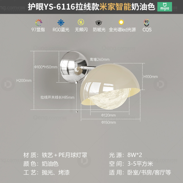 鸿瑞灯饰铁艺书房/卧室喷漆磨砂奶油风壁灯 头数:单头 型号:YS-6116拉线款奶油色+铬色-mj