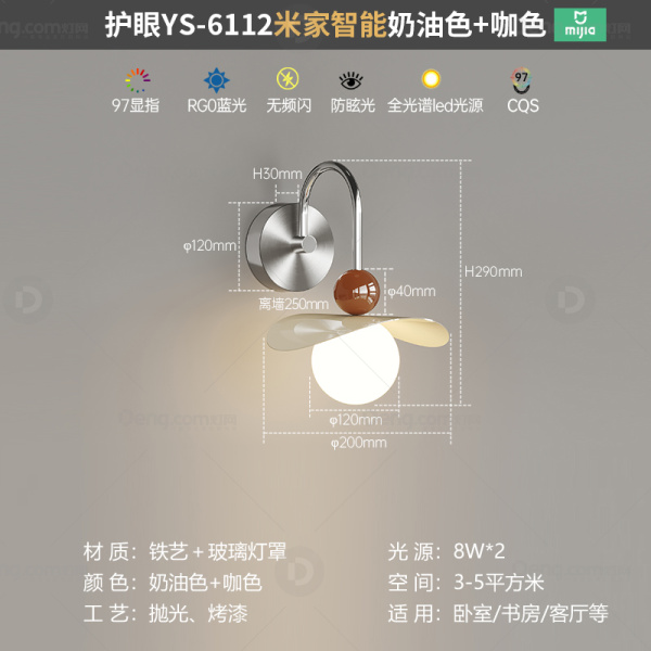 鸿瑞灯饰铁艺书房/卧室喷漆磨砂奶油风壁灯 头数:单头 型号:YS-6112款奶油色+咖球-mj