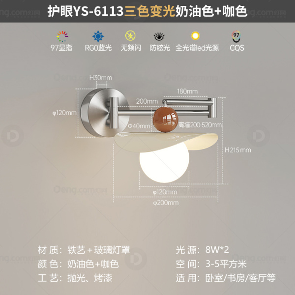 鸿瑞灯饰铁艺书房/卧室喷漆磨砂奶油风壁灯 头数:单头 型号:YS-6113款奶油色+咖球-三色