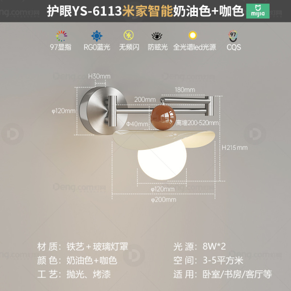 鸿瑞灯饰铁艺书房/卧室喷漆磨砂奶油风壁灯 头数:单头 型号:YS-6113款奶油色+咖球-mj