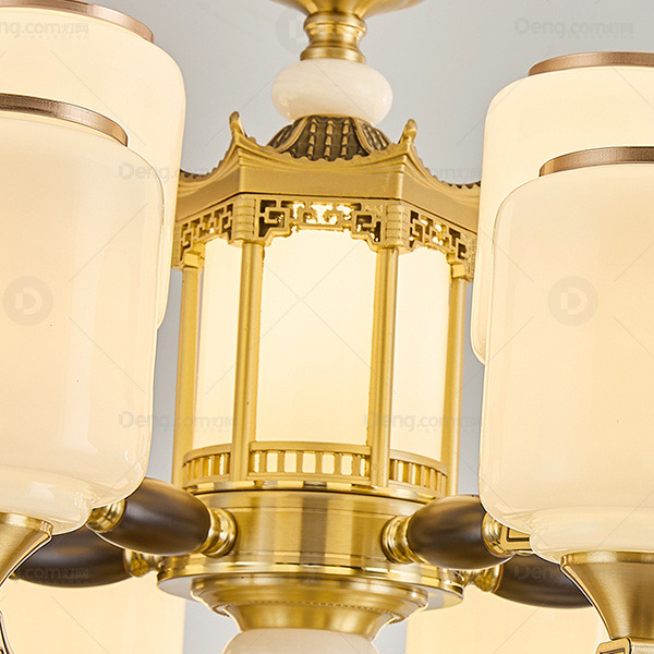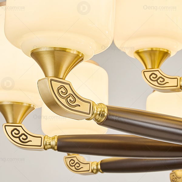新中式 吊灯 铜+沙比利木灯臂 发光中柱底锅 防尘灯罩