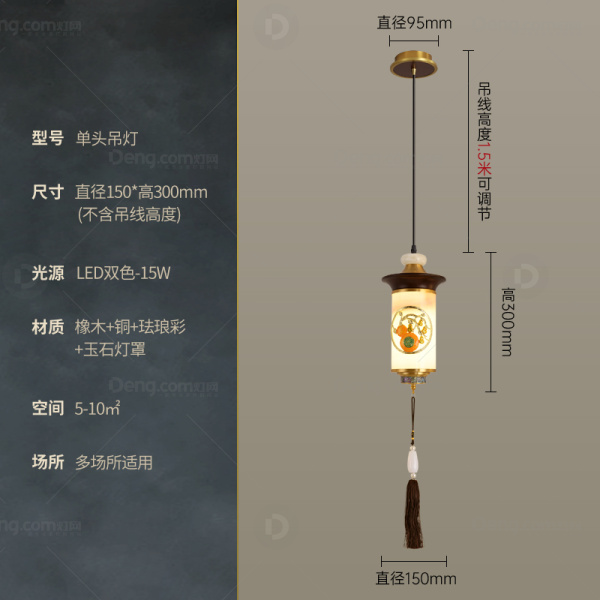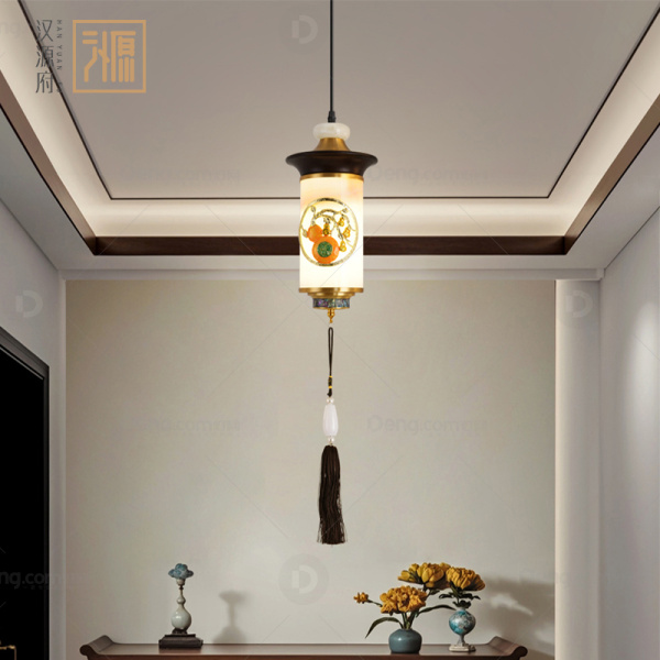 新中式胡吊灯胡桃木色橡木+铜+玉石灯罩