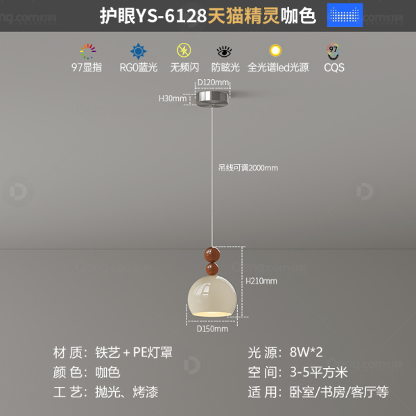 鸿瑞灯饰铁艺书房/卧室喷漆磨砂奶油风吊灯 头数:1头 型号:YS-6128吊线款奶油色+咖色-天猫