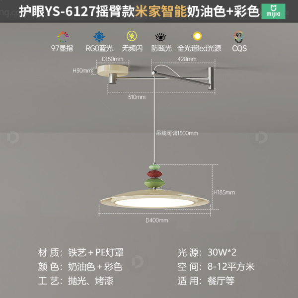 鸿瑞灯饰铁艺餐厅喷漆磨砂奶油风吊灯 头数:1头 型号:YS-6127-40摇臂款奶油色-小爱