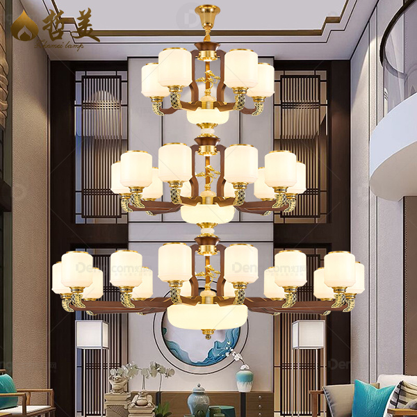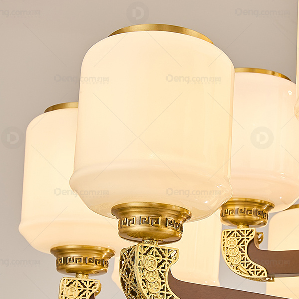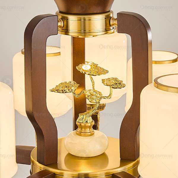 新中式 吊灯 铜合金+实木灯臂 实木拉杆中柱 防尘罩