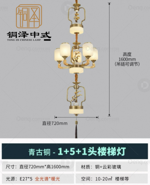 铜泽铜楼梯/拐角压铸新中式吊灯 头数:5头 型号:70002劲松映月楼梯灯