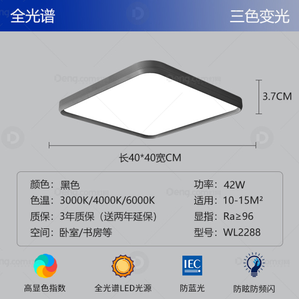 胜腾·家居照明铁艺书房/卧室喷漆磨砂其他吸顶灯 型号:E-WL2288-400*400-黑色-三色调光