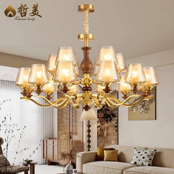 中式 吊灯 铜管 实木中柱 实木灯碟 玻璃布艺灯罩可选