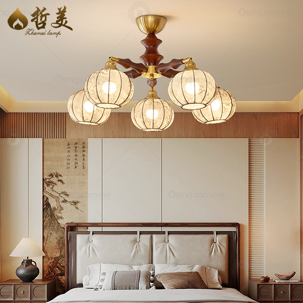 中古风 铁艺铜本色+实木吸顶灯 实木中柱 手工布艺灯罩