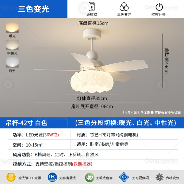 灯仕达铁艺书房/卧室其他/other奶油风风扇灯 头数:1头 型号:FS6009D-羽毛-42寸-白三色