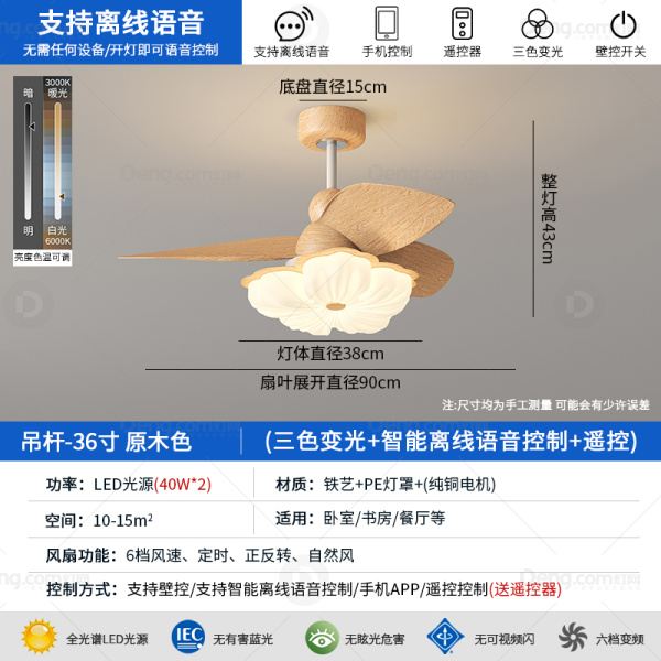 灯仕达铁艺书房/卧室其他/other奶油风风扇灯 头数:1头 型号:FS6004D-花朵-36寸-原木色离线语音