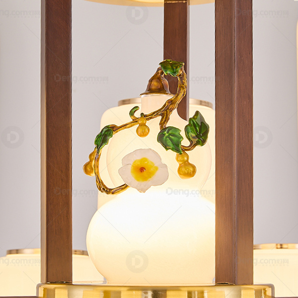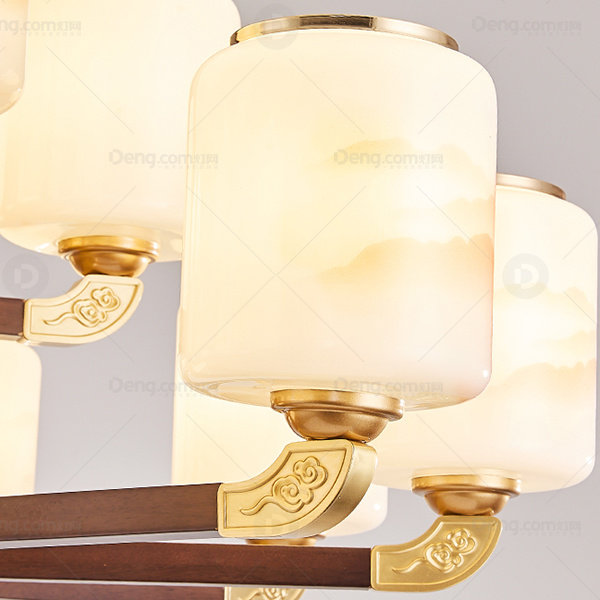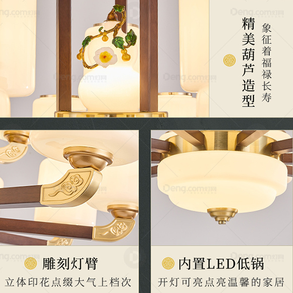 新中式 吊灯 铜+木灯臂 葫芦中柱 防尘玻璃灯罩