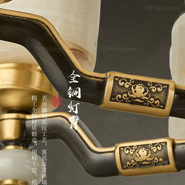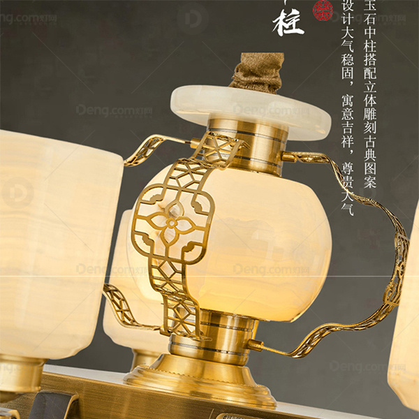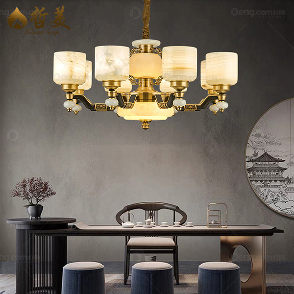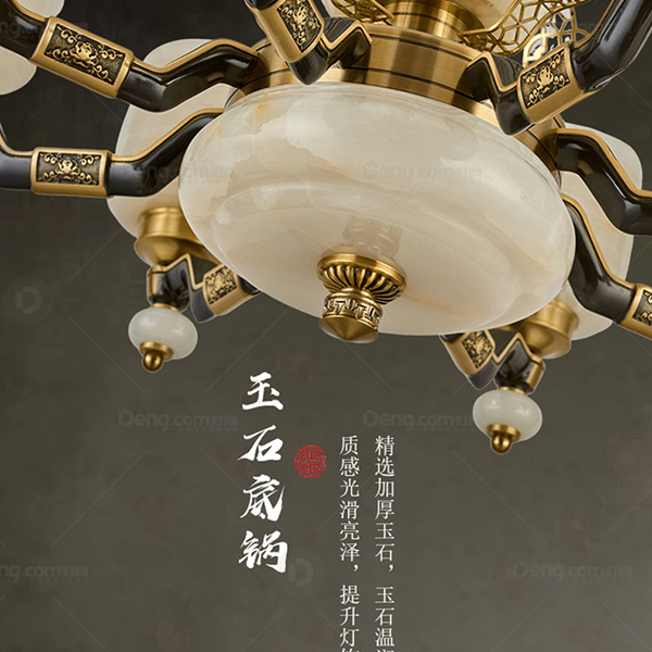 新中式 吊灯 翻砂全铜灯臂 大玉石发光中柱底锅灯罩